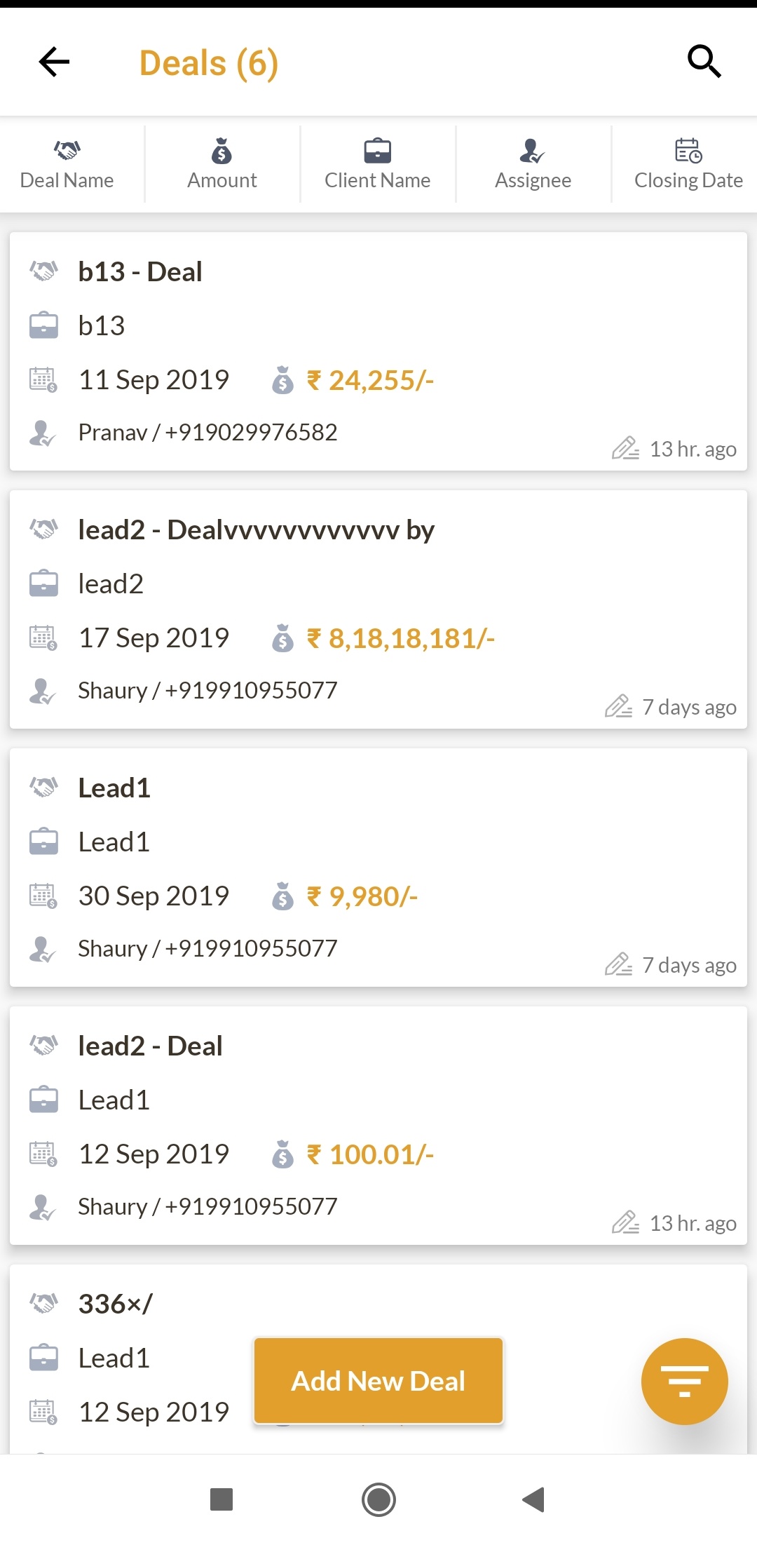 This the list of deals that the app user has access to. The deal name, amount, closing date, client name and assignee are shown. App users can sort, search and filter the list