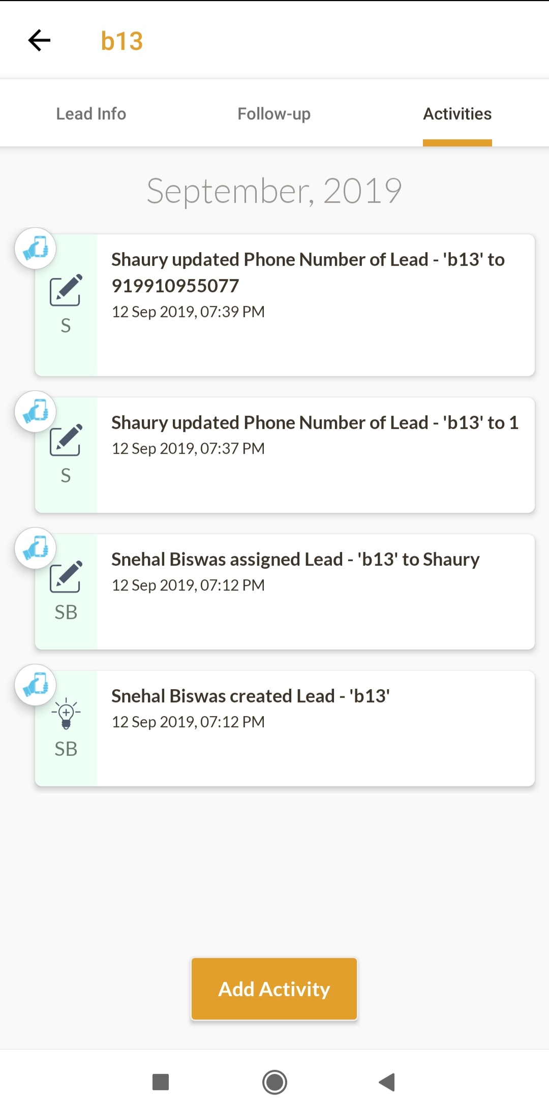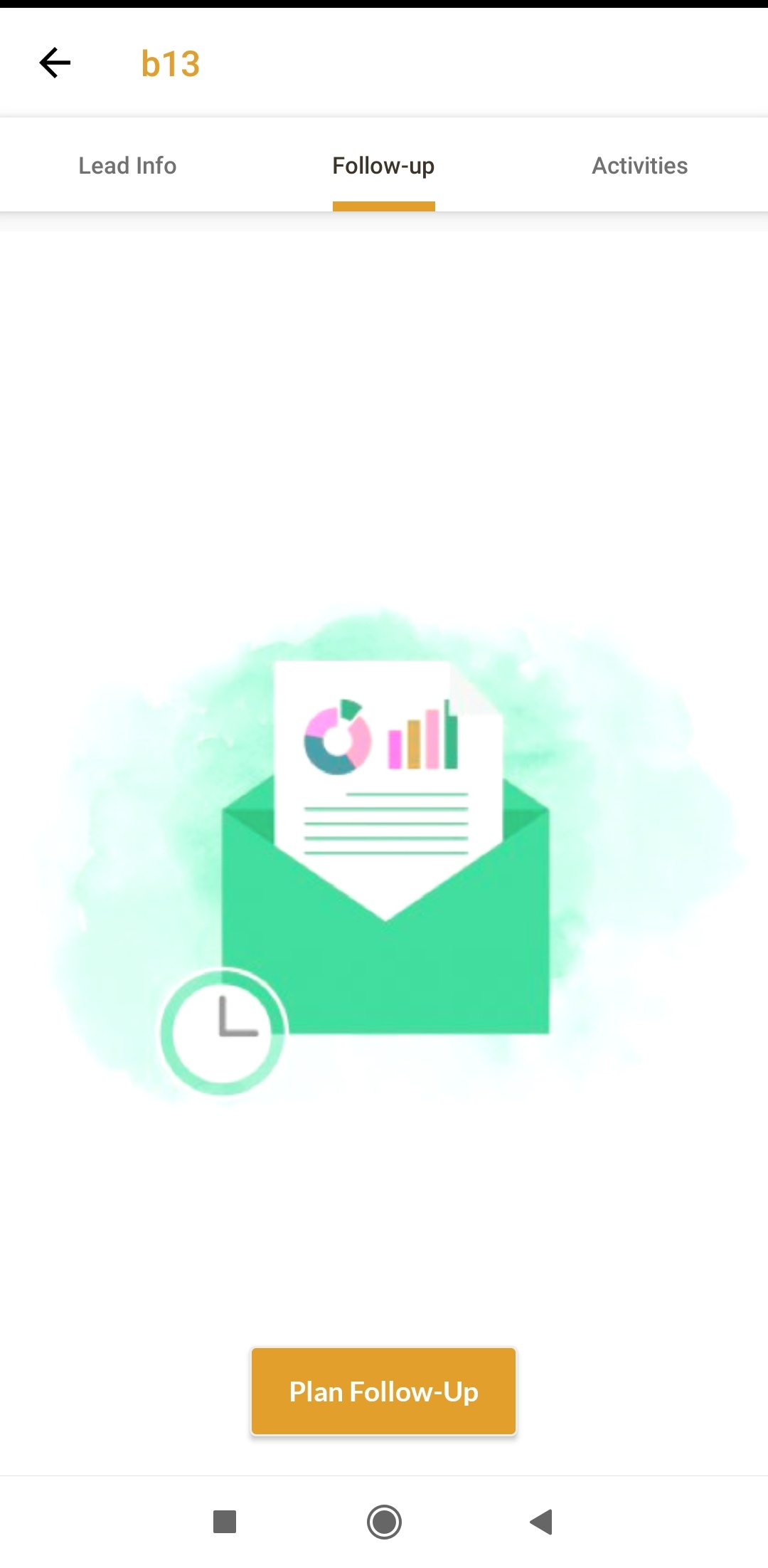 Tapping on any lead opens the lead detail page. This contains three tabs: Info , follow up and log of activities