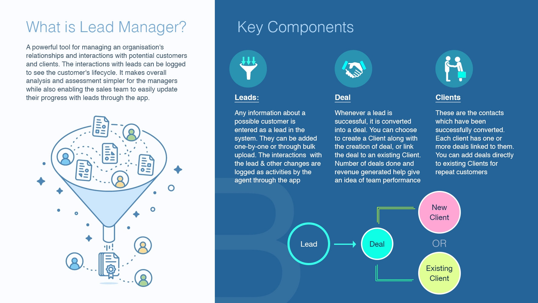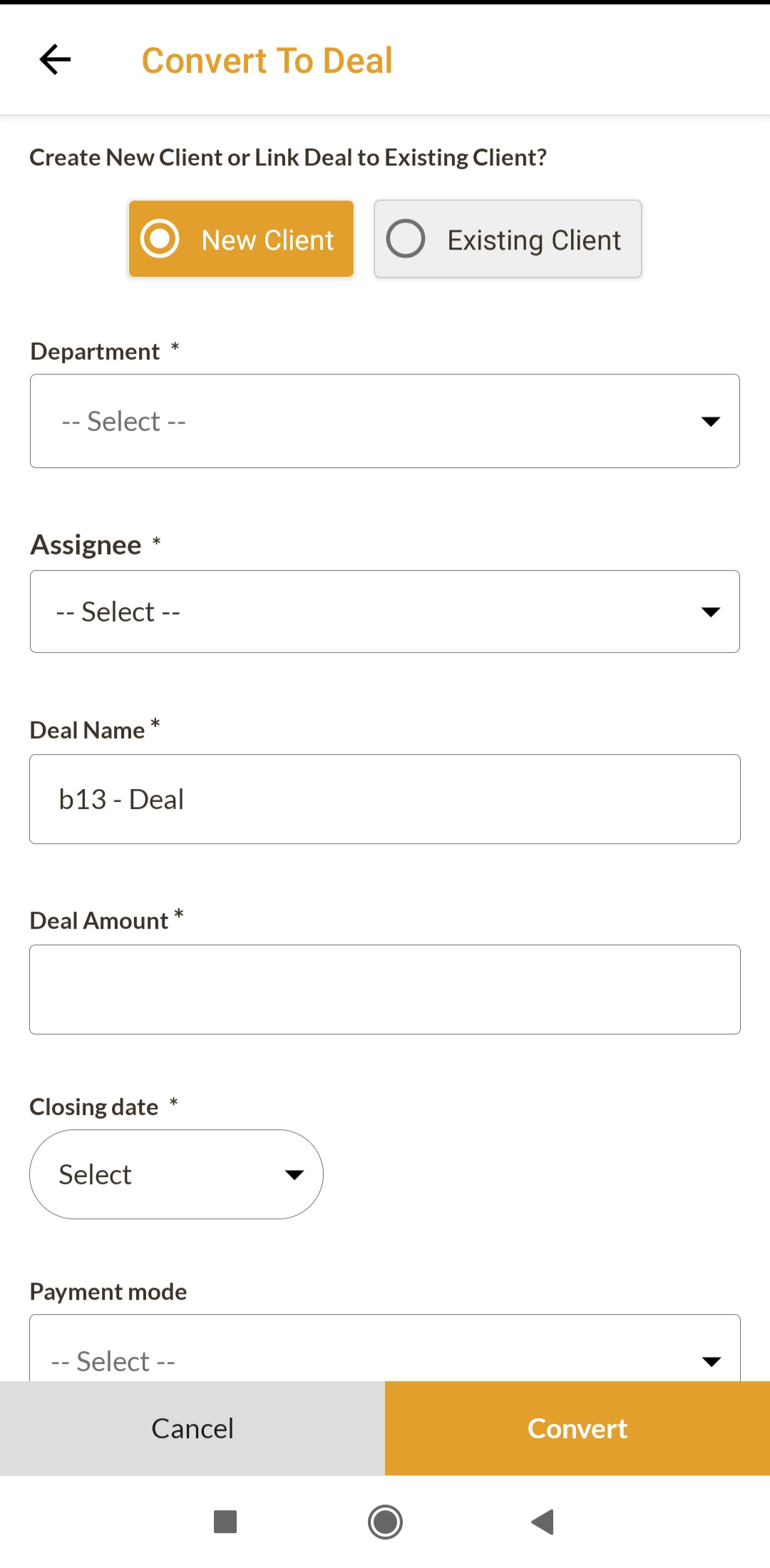 When converted into a deal, a Client is created with the same info as that of the lead and the deal is linked to the created client.