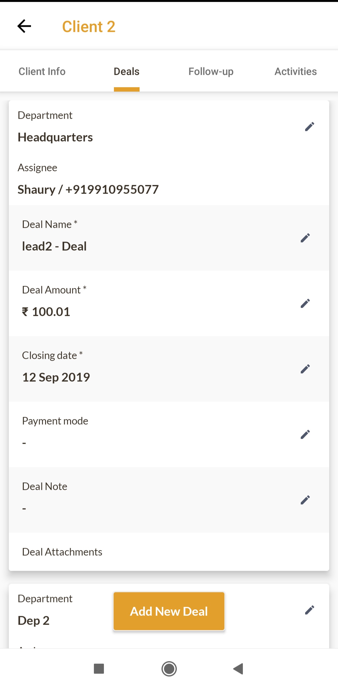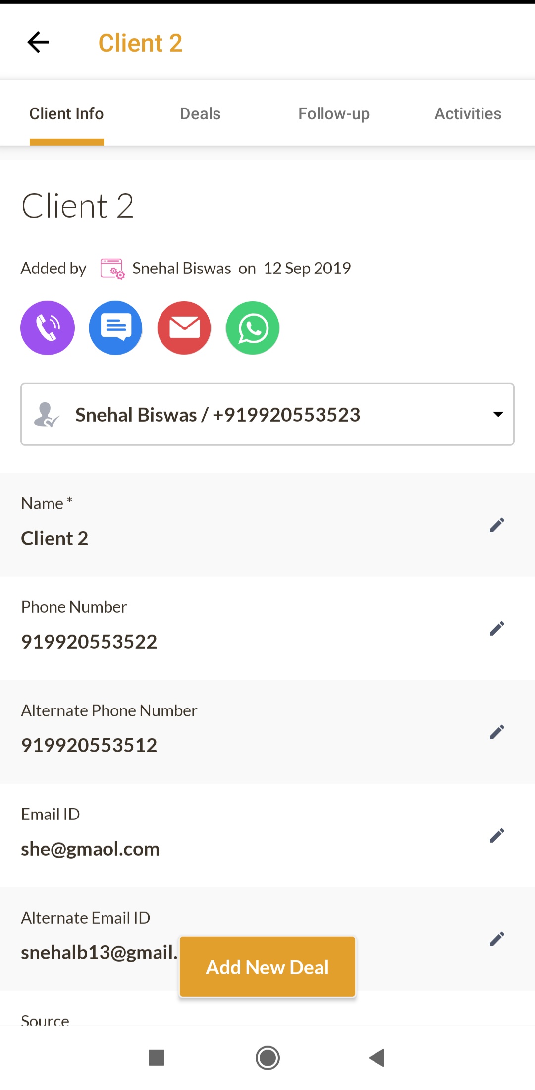 Tapping any client opens the Client detail page. The client page contains 4 tabs, one more than the lead page - Client Info, Deal list, Follow up and Activity history. The Client info has the information about the Client - compared to Leads, the stage and Priority are not present for Clients