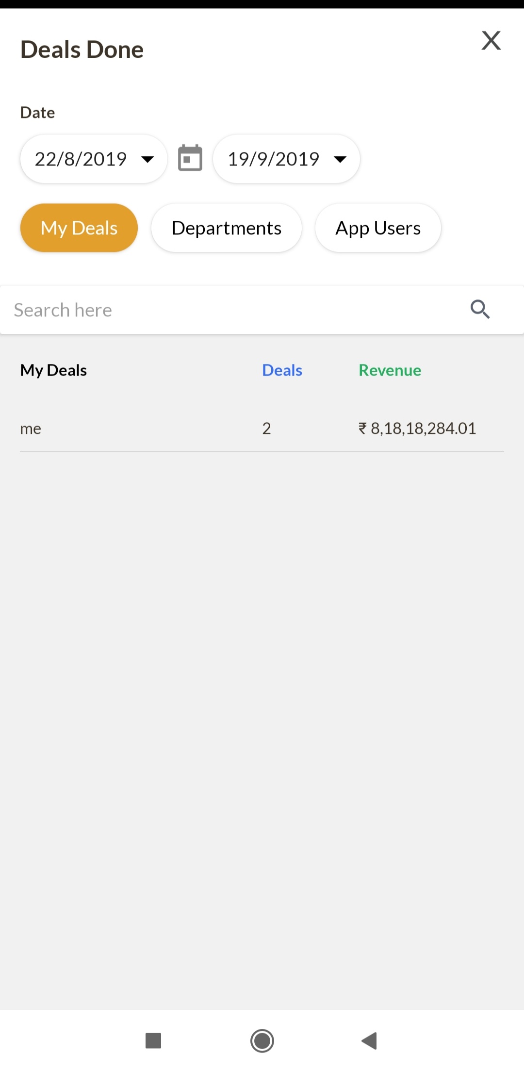 The next section allows you to see the number of deals done by selecting a time frame. You can see the deals done by you, department wise, or team member wise (other app users/assignees)