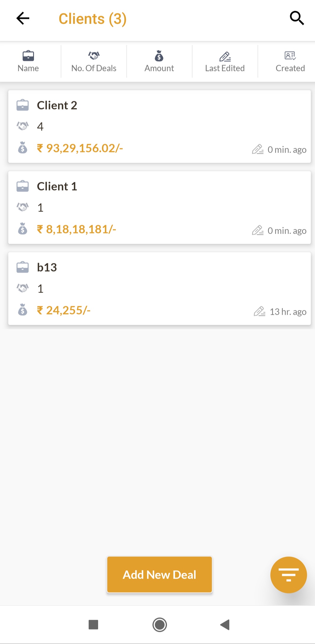This is list of the clients in the system. App users can see the clients whose deals they have access to. The number of deals and the total amount of deals is shown for clients in the list. App users can search, sort and filter on the list. They can also add a deal after choosing any of the Clients using the Add New Deal button at the bottom