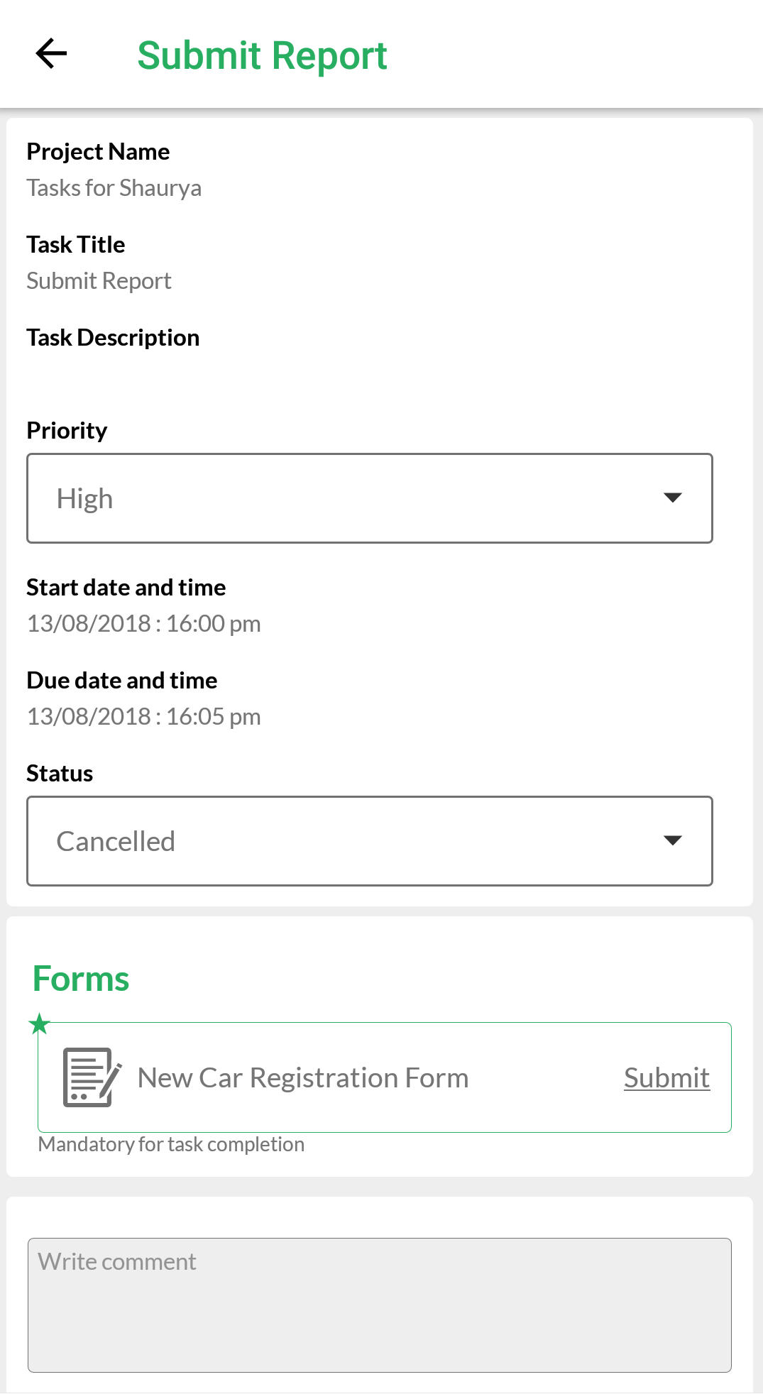 About interlinked forms: You can interlink forms to any task. The data submitted by the user corresponding to the form will be visible in the task detail itself. You also have the option to make form submission mandatory for a task. If you choose this option, then the status of the task cannot be changed to Completed unless the form is submitted atleast once.